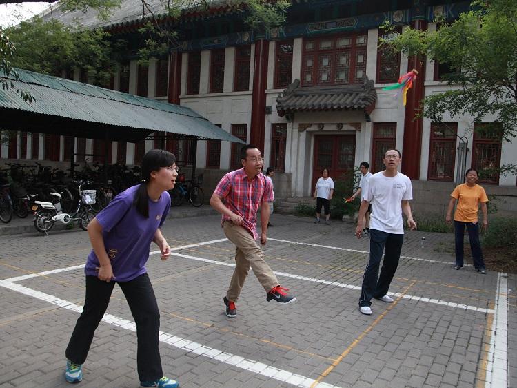 数院今年是初次组队,所有老师都没有毽球比赛的经验,因此初次合练时只得从最基本的发球与接球开始练起。5月底的北京,骄阳似火,温度飙升。即使如此,各位参赛老师仍然以饱满的热情和积极的态度参加合练,初步掌握了毽球比赛的一些基本技术。