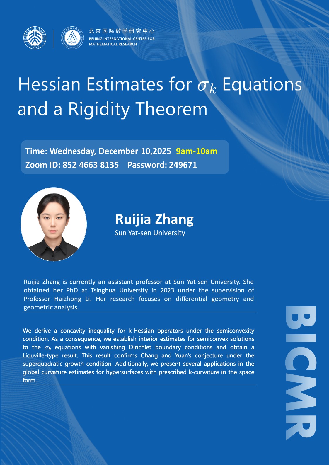 Ruijia Zhang is currently an assistant professor at Sun Yat-sen University. She obtained her PhD at Tsinghua University in 2023 under the supervision of Professor Haizhong Li. Her research focuses on differential geometry and geometric analysis.