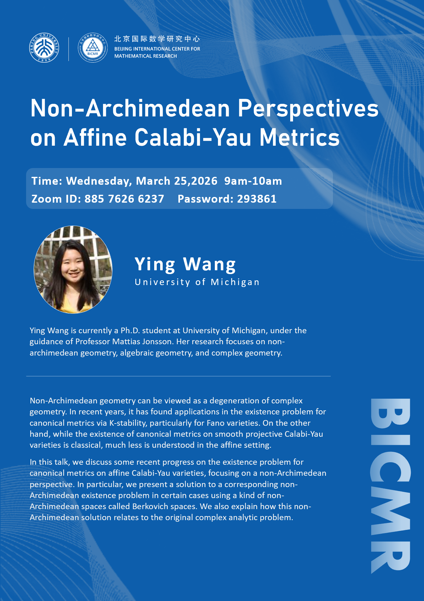 Ying Wang is currently a Ph.D. student at University of Michigan, under the guidance of Professor Mattias Jonsson. Her research focuses on non-archimedean geometry, algebraic geometry, and complex geometry.