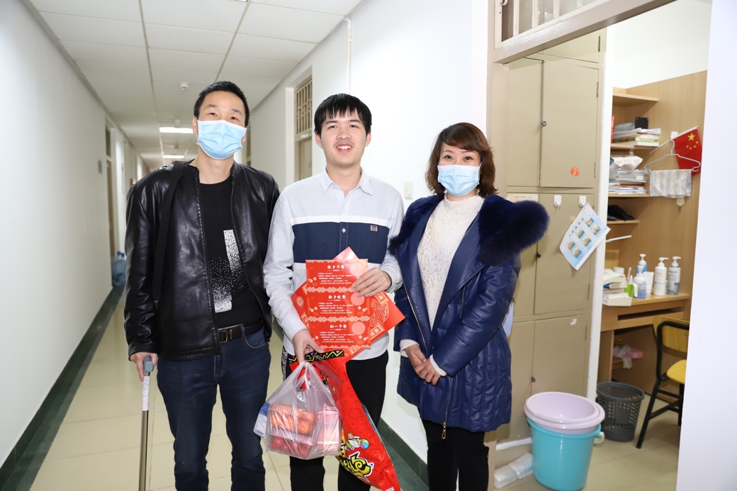 送来的春节慰问,有的同学还热心地介绍着宿舍门口张贴的春联与福字。