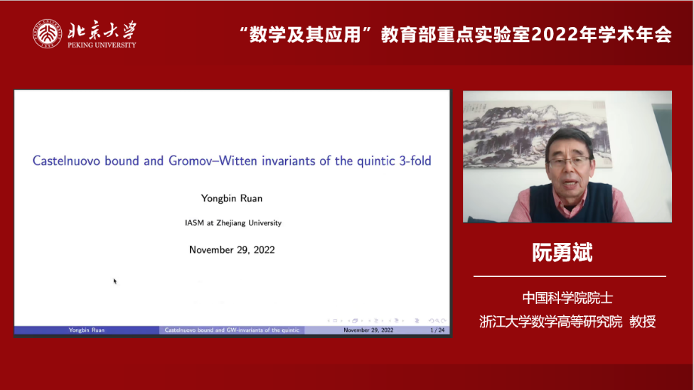 本届年会分为学术报告和学术委员会会议两个专场。在学术报告专场,浙江大学阮勇斌院士作了题为“Castelnuovo Bound and Higher Genus Gromov-Witten Invariants of Quintic 3-fold”的特邀报告;中科院数学与系统科学研究院张平院士作了题为“关于三维各向异性Navier-Stokes方程的整体解”的特邀报告。伊人直播-伊人直播app